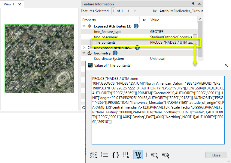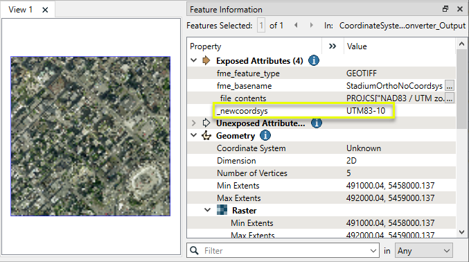 Using the FME Data Inspector to examine the features as they exit the transformer, we can see that the FME representation of the coordinate system - UTM83-10 - has been added to the new _coordsys attribute.