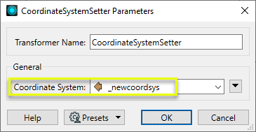 The final step is to use a CoordinateSystemSetter to apply the coordinate system. In the parameters dialog, we set Coordinate System to the recently added attribute _newcoordsys.