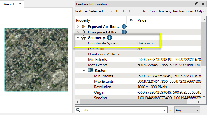 The CoordinateSystemRemover receives any feature and removes any assigned coordinate system from it. No geometry is modified, and data is not reprojected.