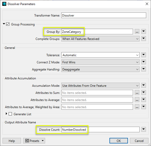 In the parameters dialog, Group By is set to ZoneCategory, so that each category will be evaluated for dissolving separately.