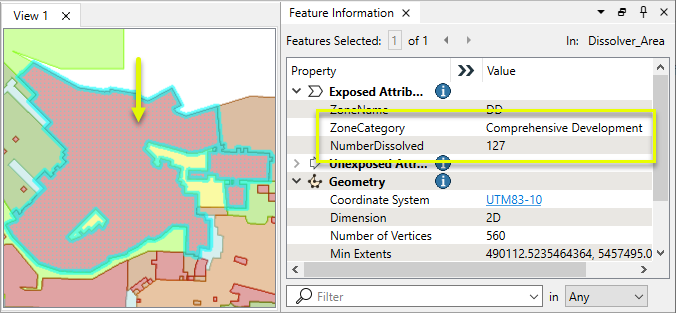 Areas have been dissolved according to category. Note the NumberDissolved attribute containing the count of polygons that went into the output area.