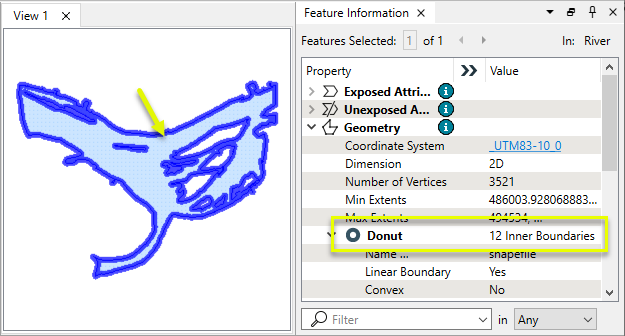 In this example, we have a donut polygon representing a portion of a major river. Note there are a number of holes, each one an island.