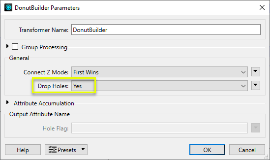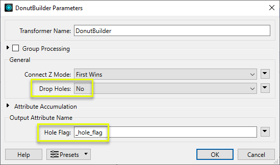 The features are routed into a DonutBuilder. In the parameter dialog, we add a new attribute that will flag which output areas are holes and which are outer shells.