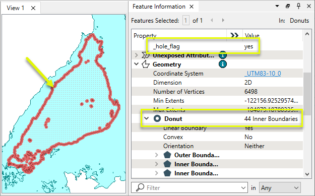 When donuts are nested, the Hole Flag attribute will alternate with each level of nesting. The outermost area is an outer shell (Hole Flag = no), the next in is a hole (Hole Flag = yes), the next in is an outer shell, the next a hole, and so on.