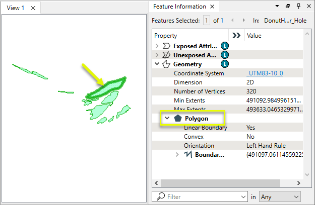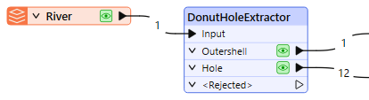 The DonutHoleExtractor receives features with donut area geometry and separates the holes from the outer shell of the polygon, creating individual geometry for each hole.