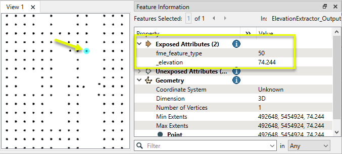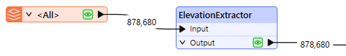 The ElevationExtractor receives any type of geometry and extracts the z coordinate value of the feature’s first coordinate into an attribute.
