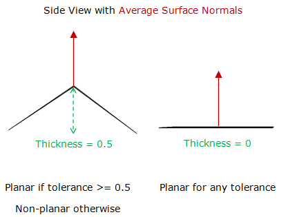 Enter a value or choose an attribute. The surface normal deviation tolerance is specified in degrees, and describes the maximum deviation from the average surface normal that a component can have before it is considered non-planar. A planar polygon has a surface normal deviation of 0. A non-planar polygon will have its average surface normal computed using Newell’s method, and the surface normal deviation of each part from the average surface normal will be computed with the cosine law. For example, consider a single, non-planar polygon. Imagine a unit normal representing the average normal of the polygon. Now imagine a unit normal for each component of the polygon. The largest different between the average surface normal, and any other surface normal is the surface normal deviation.
