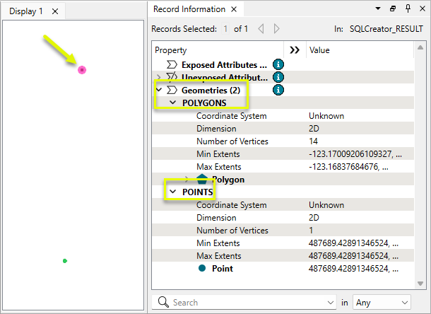In this example, we have a set of features with multi geometry. Note that two geometries exist on the feature, and are named POLYGONS and POINTS. We want to rename them to something meaningful.