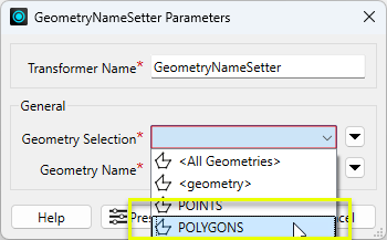 Geometry names exposed by this transformer are visible in downstream schema-aware drop-downs in transformers such as the Reprojector, GeometryRemover, and GeometryNameSetter. They are treated as if they exist in the feature schema, even if they don’t yet exist in the data.