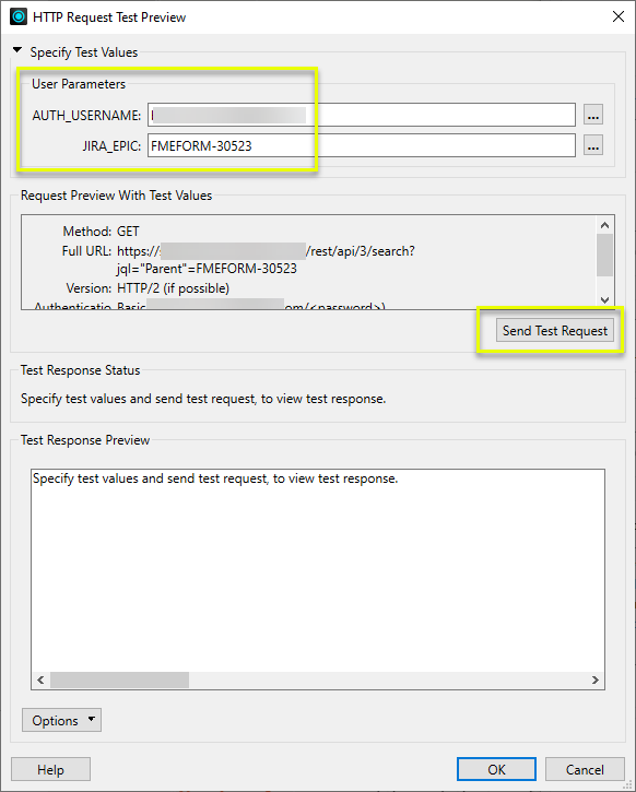 In the Test Request dialog, note that the user parameters used for configuration are available and populated. To test the configuration, use Send Test Request.