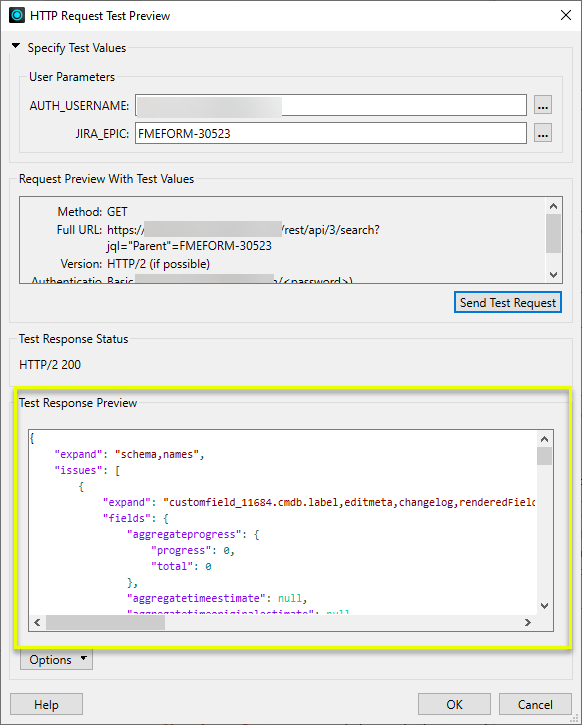 When this option is selected, each HTTP response body will be saved to an attribute of the feature which made the request. The following parameters are enabled for this option.