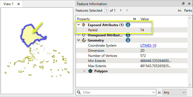 For each Park feature, the query is executed and new attributes attached. The features are output via the ParksOut port we defined, associated with the SQL query.