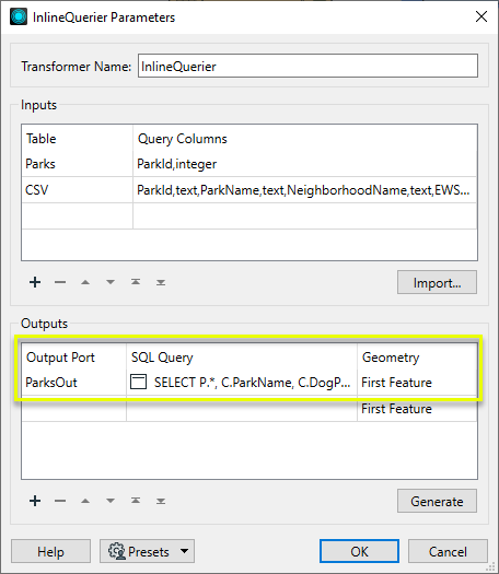 In the parameters dialog, we add an Output Port called ParksOut, and construct a SQL query that will provide the features to be output.