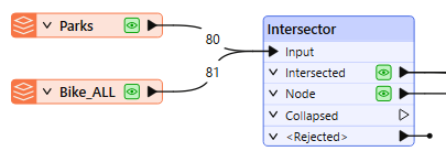 In this example, we start with a set of park polygons and bike path lines, and want to split the polygons where the lines intersect them. To do that, we will first use the Intersector, then build the segmented areas.