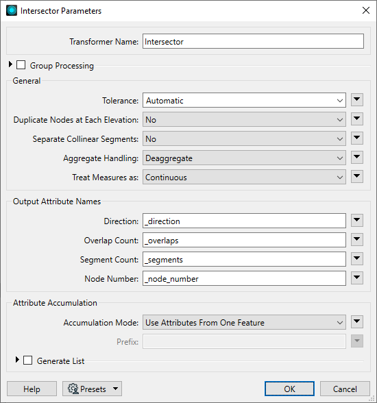 Specifies how attributes should be accumulated. Drop Attributes: All incoming attributes are removed from the features. Merge Attributes: Merges all attributes from overlapping segments. Use Attributes From One Feature: Takes all attributes from one representative feature. |