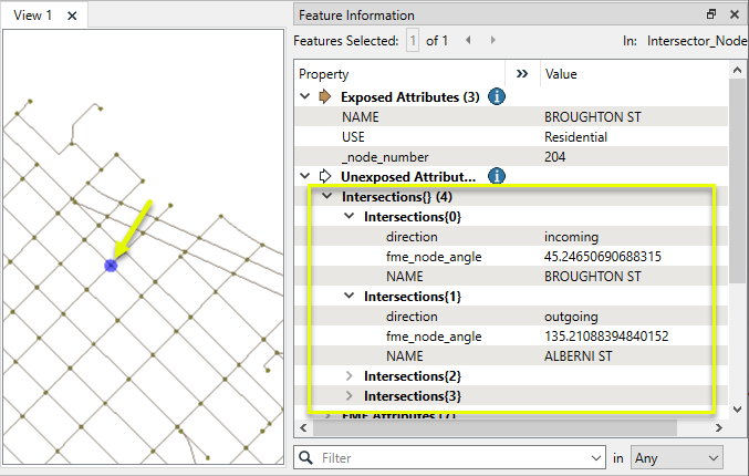 The selected node shown here has four items in the list, as four line segments converge at that point - Broughton St incoming and outgoing, and Alberni St incoming and outgoing.