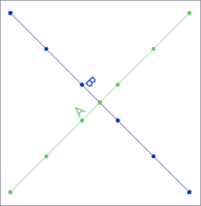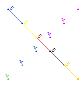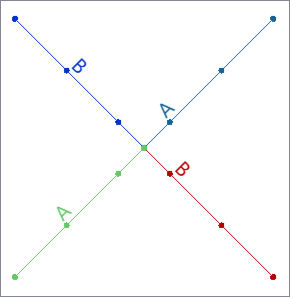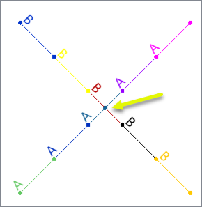 Input Lines have a Name attribute, either A or B. They intersect, having a node in common where they meet. This junction has four line segments converging. |