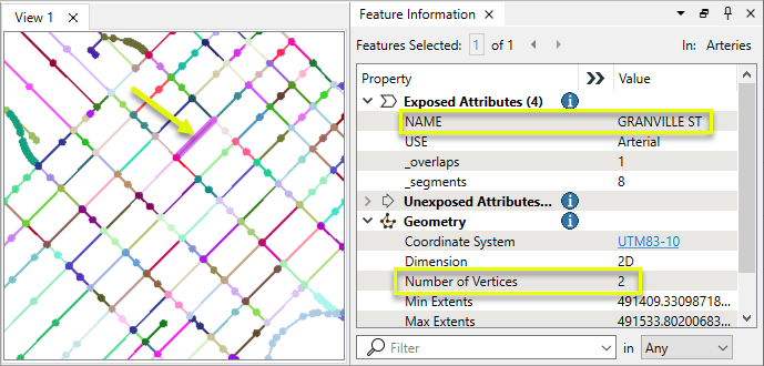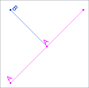 Input Two lines are input, with the attribute Name either A or B. They meet as a T intersection, where B touches A mid-line. Both lines have a vertex at that location. |