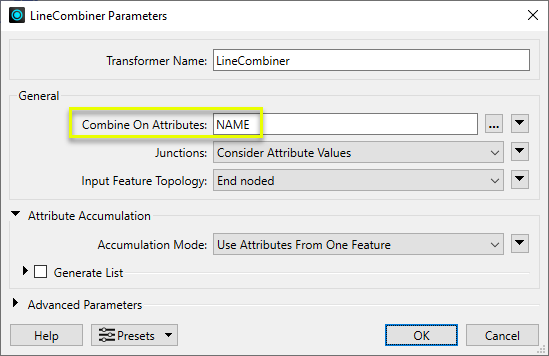 In the parameter dialog, Combine On Attributes is set to NAME.