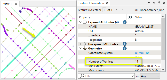 Output: 2 Lines Two lines are output, each passing through the junction. Parameter settings: Combine on Attributes: Name Junctions: Consider Attribute Values |