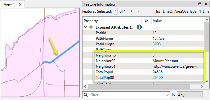 Viewing the output, we can see that the selected bike path has been split where it crosses the neighborhood boundary, and the neighborhood attributes for Mount Pleasant have been added to it.