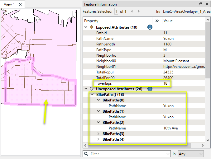 The containing neighborhood encountered 18 overlaps, and now has a list attribute containing the bike path names.