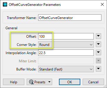 In the parameters dialog, we set the Offset to 100, which will create the new offset curves 100 meters away from the original feature (which is in a UTM projection, ground units in meters). The Corner Style chosen is Round.