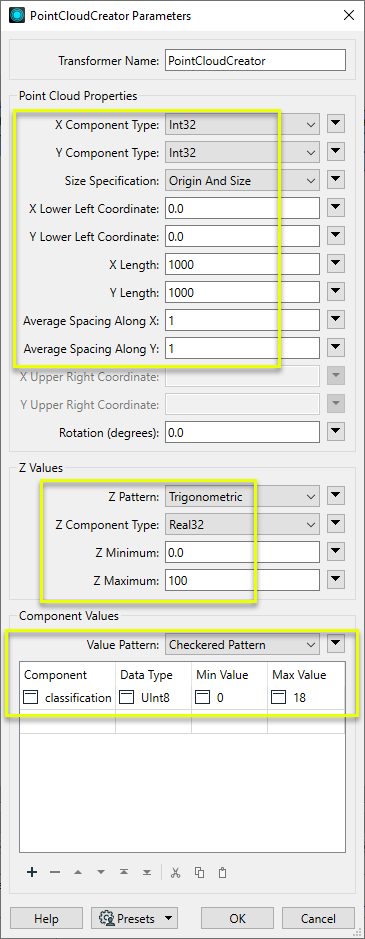 The PointCloudCreator creates a single point cloud feature, based on specified size, location, spacing, rotation, and components. Size may be defined either by an origin with X and Y Length (in ground units), or by extents (lower left and upper right coordinates).