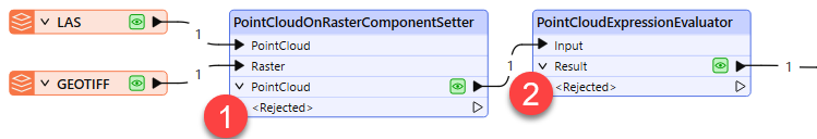 The operation will take two steps. First, both the point cloud and DEM raster are routed into a PointCloudOnRasterComponentSetter to extract the ground elevations. Then the resulting point cloud feature is sent on to the PointCloudExpressionEvaluator to calculate the AGL heights.