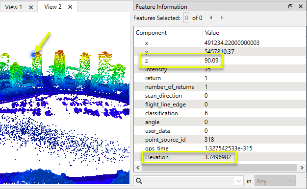 Note that the output point cloud feature has a new component - Elevation. The selected point shown here has a z value of about 90 meters -but the ground elevation at that location is only about 3.75 meters.