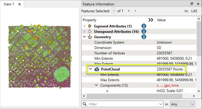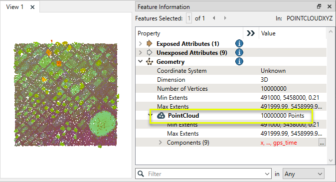 Extracts the geometry properties of a point cloud feature and exposes them as attributes, optionally checking for their existence, retrieving component properties, and finding minimum and maximum values. Extents may also be recalculated and updated. |