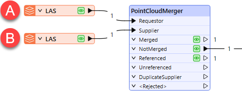 Both point clouds are routed into a PointCloudMerger. The first (A) is the Requestor, and the second (B) is the Supplier. Any components on B will be merged onto A.