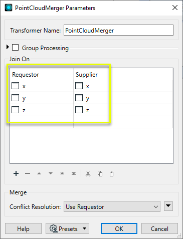The PointCloudMerger receives point cloud features and merges them, identifying matching individual points based on component values which may include both location (x, y, and z components) and other standard or user-defined components.