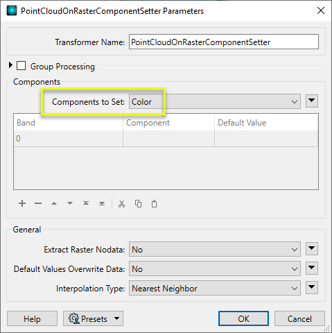 - The PointCloudOnRasterComponentSetter may be useful to transfer data values when handling non-point cloud data types as point clouds for processing efficiency.