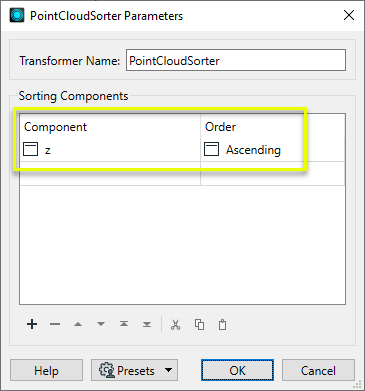 This table specifies the components by which the point cloud will be sorted.