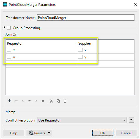 Merges point clouds by joining points where selected component values match (join key), including x, y, z, and other components. Component values are transferred between point clouds and output is filtered based on matching success and duplication. |