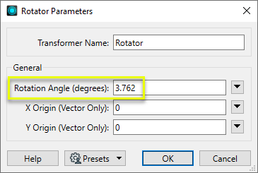 In the parameters dialog of the Rotator, we set a Rotation Angle of 3.762 degrees.