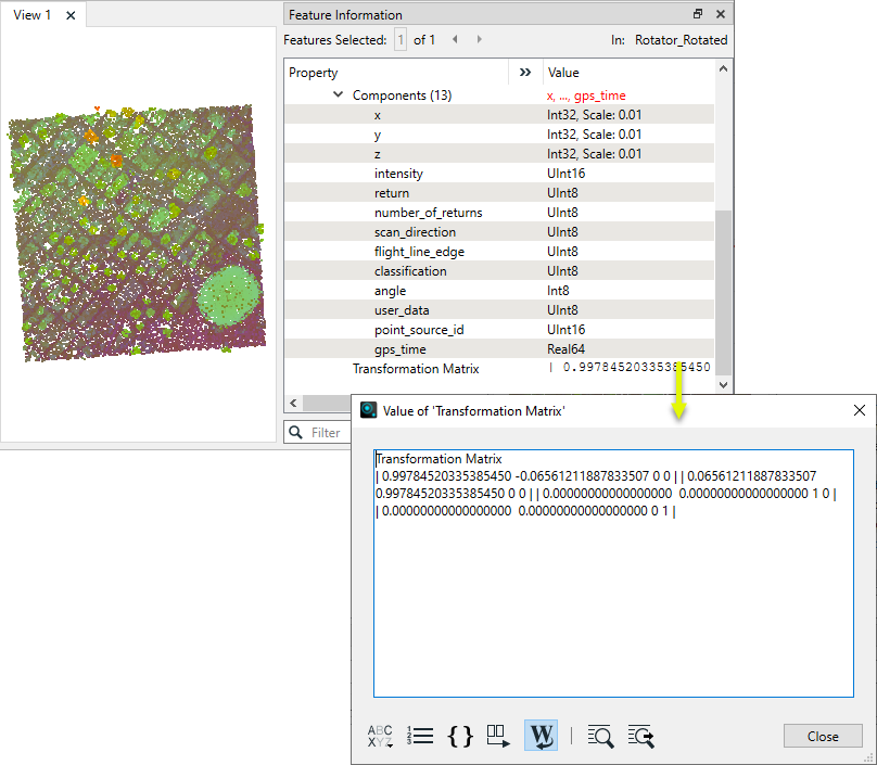 Examining the point cloud as it exits the Rotator, note the newly added Transformation Matrix. Like the Scale transformation, this does not re-calculate the component values - it just describes how they are to be manipulated.