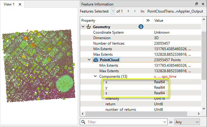 If we examine the component values of a single point in the point cloud, we can see how the Scale of 0.01 is interpreted to show coordinates with two decimal places.