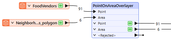 To find which neighborhood a vendor is in, we connect the food vendor points to the Point input port, and the neighborhoods to the Area input port.