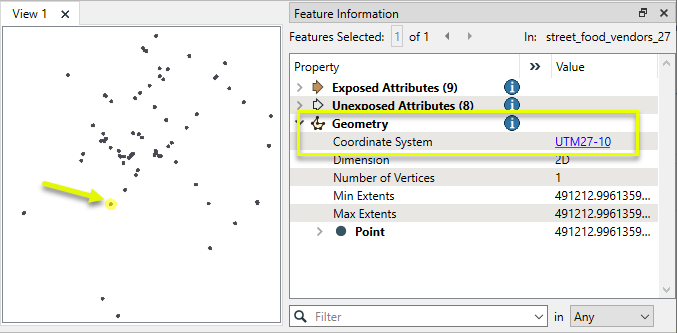 In this example, we have a shapefile of food cart vendors, with a UTM Zone 10 NAD27 coordinate system. We want to reproject this to NAD83, using PROJ.