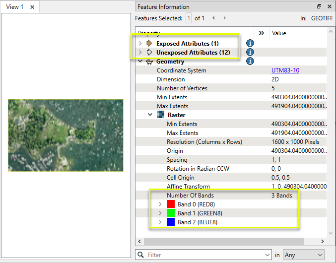 In this example, we will extract the band properties on an RGB orthoimage. Note that the source raster feature has a number of attributes, and 3 bands.