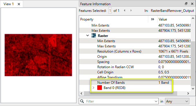 The output raster feature contains only one band - Band 0, Red.