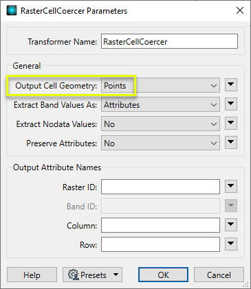 In the RasterCellCoercer parameters dialog, Output Cell Geometry is set to Points.