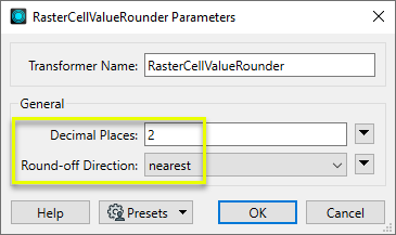 - If applying rounding to floating-point (decimal) values that are stored as real32, consider coercing the raster or band to interpretation type real64 prior to using this transformer to avoid unexpected results. The RasterInterpretationCoercer or RasterBandInterpretationCoercer may be used to do this.