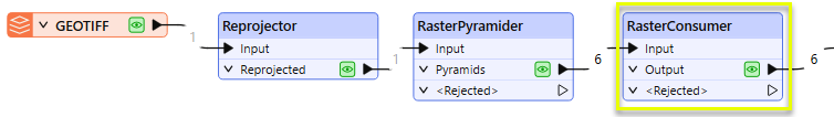 To get a more accurate idea of how long this will take, we add a RasterConsumer after the two raster processing transformers - the Reprojector and RasterPyramider.
