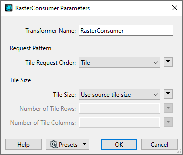 Use source tile size (Default): The default tile size reported by the band will be used when tiles or bands are consumed. Specify source tile size: The raster will be consumed using the specified Number of Tile Rows and Number of Tile Columns. |