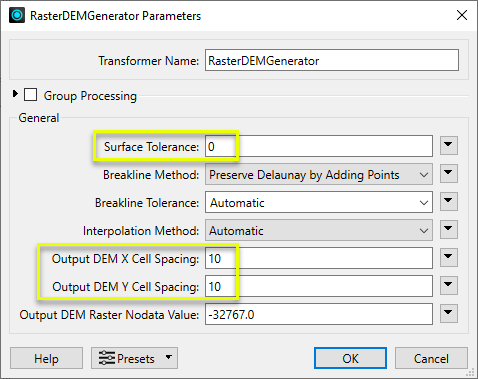 Next, in the RasterDEMGenerator’s parameters dialog, we set Surface Tolerance to zero (0), which means that no vertex filtering will take place, and all points will be considered.
