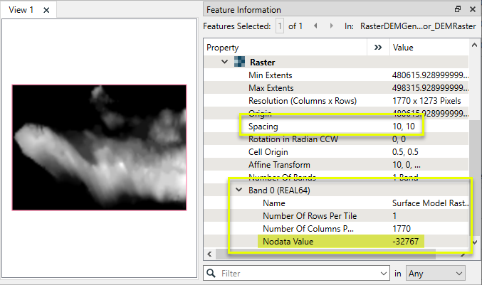 This output port samples the underlying surface model according to the sampling rates specified in Output DEM X Cell Spacing, and Output DEM Y Cell Spacing, and produces a single raster feature consisting of evenly spaced 3D points arranged by rows and columns.