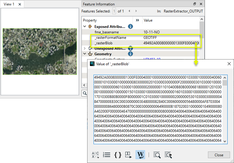 Examining the output from the RasterExtractor in the FME Data Inspector, note that the feature has two new attributes - _rasterBlob, containing the encoded raster, and _rasterFormatName, containing the name (GeoTIFF) of the chosen encoding.
